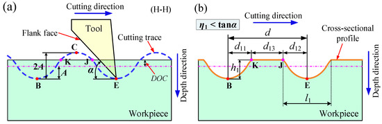 As shown in Figure 5a, when tool moves along cutting trace, the flank face has no intersection with the cutting trace, that is, η1 < tan α, which can be considered to be the first state. Under this state, the cross-sectional profile of dimples in cutting direction can be seen from the Figure 5b. It can be seen that the flank face has no effect on the dimple profile which is only related to the cutting trace. The adjacent dimple profile is discrete. There is a distance d13 in the middle, which belongs to the uncut surface. Under this state, the dimple depth h1 can be expressed by the following: