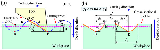 As shown in Figure 6a, when the tool moves along cutting trace to point E, the flank face intersects with the KJ segment of the cutting trace on point O, that is, η1 > tan α > η2, which can be considered to be the second state. Under this state, the flank face intersects with the workpiece surface on the F point. The angle between OE and BE is θ3, which is equal to the clearance angle of tool. The cross-sectional profile of the dimples in the cutting direction can be seen form Figure 6b. The adjacent dimples in the cutting direction are still discrete, and a distance d23, corresponding to the uncut surface, also exists between the adjacent dimple profiles. Because of the intersection between the flank face and cutting trace, a part of dimple profile can be approximated by the FE segment. The corresponding length d22 also changes, which can be calculated by the following:
