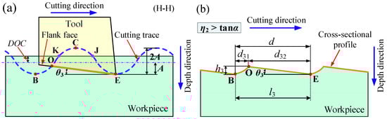 As shown in Figure 7a, when tool moves along the cutting trace to reach point E, the flank face intersects with the BK segment of the cutting trace on point O, that is, η2 > tan α, which can be considered to be the third state. The cross-sectional profile of the dimples is shown in Figure 7b. For the third state, the generation process of the micro-dimples is similar to that under the continuous cutting condition. The distance between adjacent dimples along cutting direction is equal to the dimple length l3, including two parts of d31 and d32, which can be obtained from the following: