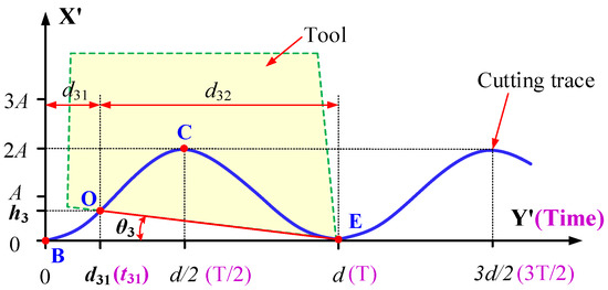 Because the cross-point O on BK segment is below the workpiece surface, the dimple depth h3 is different from that of the first two states. In order to facilitate the calculation of h3, the sinusoidal cutting trace, varying with time under the state of η2 > tan α, is firstly expressed in Figure 8. The value of the Y′ coordinate corresponding to point O is d31, as well as the corresponding time point, is t31. The d31 can be calculated by the following: