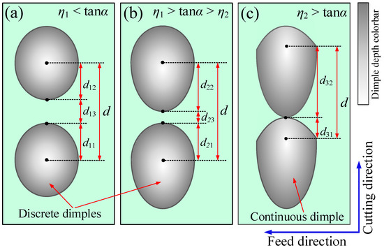 Based on the above theoretical analysis, the intersection state can greatly influence the dimple profile in the cutting direction, which, in turn, affects the distribution, size, and shape of micro-dimples. The illustration of the dimple shape, under different states, can be seen in Figure 9. Under the states of η1 < tan α and η1 > tan α > η2, the dimples along cutting direction are discrete, showing different degrees of ellipse. For the first state, the shape of single micro-dimple is symmetrical, up and down, along the cutting speed. For the second state, however, the shape of single micro-dimple is asymmetric along the cutting direction. When η2 > tan α, the adjacent dimples are continuous. The shape of single micro-dimple becomes scaly-like and more asymmetric along the cutting direction. Therefore, by choosing the proper processing parameters to change the intersection state, the micro-dimples with specific characteristics can be fabricated.