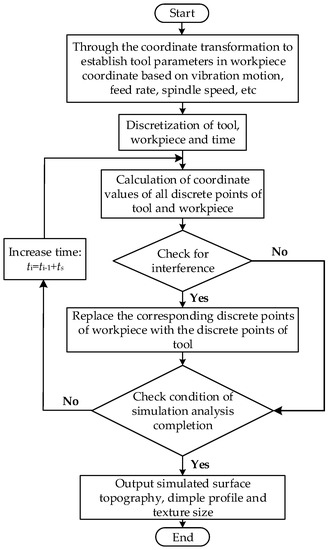 Simulation analysis is an effective way to predict the surface topography and provide the reference for the optimization of processing parameters. Guo et al. used a proposed simulation model to predict the texture topography of surface fabricated by elliptical vibration texturing process, and the feasibility of simulation model is verified by experiments [21,32]. On account of the proposed theoretical model, a simulation model, referring the previous model [21,32], is further modified for this 1D UVAT. The proposed simulation model is used for computational analysis, which can output the simulated topography of the micro-textured surface, dimple profile, and corresponding texture size. The principle of tool profile replication is the basis for the simulation analysis of surface topography. That is, under the ideal assumption, the texture topography is the reflection of tool edge geometry and motion path on the workpiece surface. The overall flow chart of the simulation process can be seen in Figure 10.