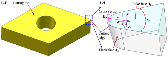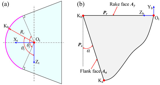As shown in Figure 11 and Figure 13a, a point (Kb) is set on the cutting edge. The angle between the line OtKb and the Zt axis is θt, and its value range is . The cross-section of the cutting tool, along OtKb direction, can be seen in Figure 13b. The clearance angle (α) is the angle between flank face (Aα) and cutting plane (Ps). The rake face (Aγ) coincides with the basal plane (Pr). The coordinate axis, along the OtKb direction, is set as the Zb axis. The Yb axis coincides with the Yt axis.