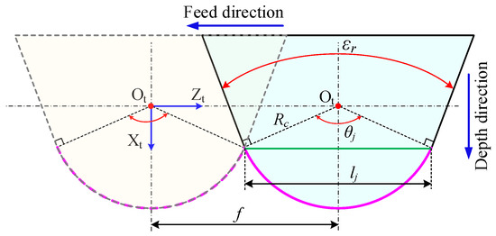 It should be specially noted that, in this simulation analysis process, the selection of feed rate, based on this tool geometry, should not be greater than the value of lj (length of green line, as shown in Figure 12). The lj can be calculated by the following: