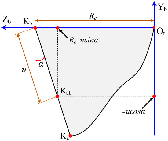 The detailed expression of line KbKa in YbZb rectangular coordinates can be seen in Figure 14. Kab is the point on the line KbKa that corresponds to the profile of flank face. The distance from point Kab to vertex Kb is set to u. The coordinate values of the Kab point, corresponding to the Yb and Zb axis, are −ucosα and Rc − usinα, respectively. Therefore, the profile line KbKa can be expressed by the given variable u: