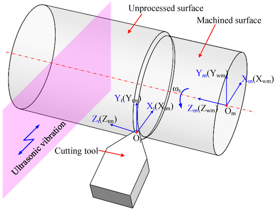 The simulation analysis needs to establish four coordinate systems to transform the expression of the geometry model from the tool coordinate systems to the workpiece coordinate systems, as shown in Figure 15. Except for the tool coordinate system Ot-XtYtZt, the other three coordinate systems are tool–machine coordinate system Ot-XtmYtmZtm, machine coordinate system Om-XmYmZm, and workpiece coordinate system Om-XwmYwmZwm. For the coordinate systems built by Guo et al. [32], three angles, including Gα, Hα, and Lα, need to be established for the rotation transformation from tool coordinate system to tool–machine coordinate system. In the paper, the parameters of Gα, Hα, and Lα are all set to 0°, which can also satisfy the processing requirements of 1D UVAT. Therefore, the established tool coordinate system coincides with the tool–machine coordinate system. The tool–machine coordinate system can be transformed to the machine coordinate system, through the matrix T (Xinit+DOC, hm, fv·t), which can be expressed by the following:
