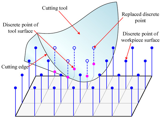In the programing process of MATLAB, the discretization of parameters, corresponding to space and time, should be performed. The cutting tool and workpiece both need to be discretized into mesh grids. The corresponding interval of mesh grids depends on a proposed spatial resolution (ζ), and the angle resolution is determined by the ratio of spatial resolution to the corresponding radius [21,32]. For the workpiece, the length Lw and the azimuth θw are discretized by the resolutions of ζ and ζ/R0, respectively. For the cutting tool, the parameters of u and θt are also discretized by the resolutions of ζ and ζ/Rc, respectively. The discretization of time can be achieved by setting the time step (ts). The size of time step is determined by the number of time point (nt) taken in a vibration period, and it can be expressed by the following: