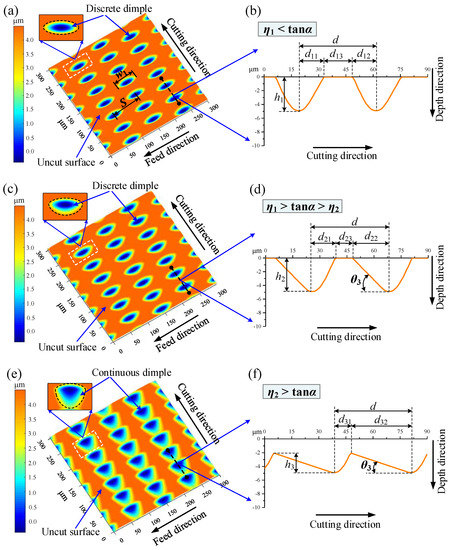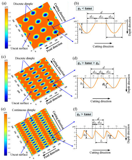 When the vibration amplitude is 8.0 μm, the intersection state is η2 > tan α, and the corresponding simulated surface topography and dimple profile can be seen in Figure 19e,f. It can be found that the distribution of adjacent dimples, in the cutting direction, changes from discrete to continuous. The corresponding simulated values of d31 and d32 are 11.2 and 31.4 μm, respectively. Compared with the theoretical values of 11.0 and 31.6 μm, the deviation is 1.8% and 0.6%, respectively. As for the dimple depth, h3, the simulated value is 8.3 μm, which has a deviation of 2.4%, compared with the theoretical value of 8.5 μm. The angle θ3 is simulated to be 14.7°, which has a deviation of 2.0%, compared with the clearance angle. The corresponding comparative values of dimple profile are also summarized in Table 3. Same with the theoretical analysis, when vibration amplitude changes from 3.9 to 8.0 μm, the dimple width also increases from 61.8 to 82.9 μm.