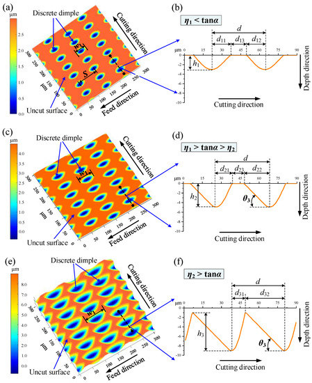 When the clearance angle is 5°, the flank face intersects with the cutting trace, and the corresponding intersection state is η2 > tan α. The simulated surface topography and dimple profile can be seen in Figure 17e,f. It can be seen that the micro-dimples in the cutting direction change from discrete to continuous. The micro-dimples in the feed direction continue to be discrete, and the middle area between the adjacent dimples also refers to the uncut surface. Same with the dimple shape illustrated in Figure 9c, the simulated dimple shape is also scaly-like, as shown in Figure 17e. Under this intersection state, the simulated dimple profile is consistent with the theoretical dimple profile, shown in Figure 7b. The distance (d) also includes two parts, i.e., d31 and d3. The angle θ3 corresponding to d32 also exists in the dimple profile, as shown in Figure 17f. The simulated values of d31 and d32 are 9.4 and 33.2 μm, respectively. Compared with the theoretical values of 9.0 and 33.6 μm, the deviation is 4.4% and 1.2%, respectively. As for the dimple depth h3, the simulated value is consistent with the theoretical value, which are both 2.9 μm. Same with the value of clearance angle, the simulated value of θ3 is also 5°. The corresponding comparative values of the dimple profile are summarized in Table 1. When the intersection state is η2 > tan α, the change rule of surface topography and dimple profile is also verified by the simulation analysis.