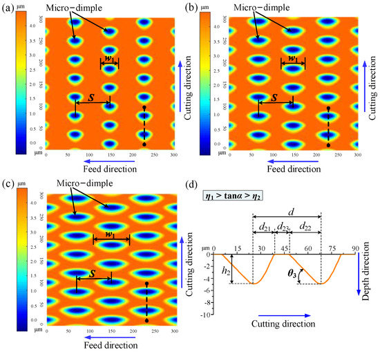When the clearance angle is 15°, the flank face intersects with the cutting trace, and the corresponding intersection state is η1 > tan α > η2. The simulated surface topography and dimple profile can be seen in Figure 17c,d. The discrete dimples are also evenly distributed on the workpiece surface. Same with the theoretical analysis, under this intersection state, the oval-like dimple is asymmetric along cutting direction, as shown in Figure 17c. The simulated dimple profile is also consistent with the theoretical dimple profile shown in Figure 6b. The distance (d) also includes three parts, i.e., d21, d23, and d22. The angle θ3, corresponding to d22, also exists in the dimple profile, as shown in Figure 17d. The simulated values of d21, d23, and d22 are 12.6, 10.6, and 19.6 μm, respectively. Compared with the theoretical values of 12.4, 11.9 and 18.3 μm, the deviation is 1.6%, 10.9%, and 7.1%, respectively. As for the dimple depth, h2, the simulated value is consistent with the theoretical value, which are both 4.9 μm. The simulated value of θ3 is 14.0°, which has a deviation of 6.7%, compared with the clearance angle. The corresponding comparative values of the dimple profile are summarized in Table 1. In summary, the influence of the intersection state (η1 > tan α > η2) on the surface topography and dimple profile can be further verified from the respective simulation analysis.