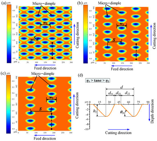 When the clearance angle is 25°, there is no intersection between the flank face and cutting trace (η1 < tan α). The corresponding surface topography and dimple profile can be seen in Figure 17a,b. It can be seen that the discrete, oval-like micro-dimples are evenly distributed on the workpiece surface, which is consistent with the dimple shape shown in Figure 9a. The areas between adjacent dimples refer to the uncut surfaces. The distance between the adjacent dimples, along feed direction, S, is equal to the feed rate, which is measured to be 80 μm. The simulated dimple profile, in the cutting direction, is also consistent with the theoretical dimple profile shown in Figure 5b. The distance (d) also includes three parts, i.e., d11, d13, and d12. The corresponding simulated values of d11, d13, and d12 are 13.2, 16.4, and 13.2 μm, respectively. Compared with the theoretical values of 12.4, 17.8, and 12.4 μm, the deviations are 6.5%, 7.9%, and 6.5%, respectively. As for the dimple depth h1, the simulated value is same as the theoretical value, i.e., 4.9 μm. The corresponding comparative values of the dimple profile are summarized in Table 1. Through the above analysis, the simulation results, regarding the size, shape, and distribution of the micro-dimples generated under an intersection state of η1 < tan α, are highly consistent with the theoretical analysis.