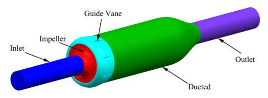 To conduct a preliminary analysis of the hydraulic performance of the diving tubular pump, three-dimensional modeling of the water body is built as the computational domain of the diving tubular pump. As shown in Figure 1, the computational domain is composed of five parts: the inlet pipe, the impeller, the spatial guide vane, the ducted, and the outlet pipe.