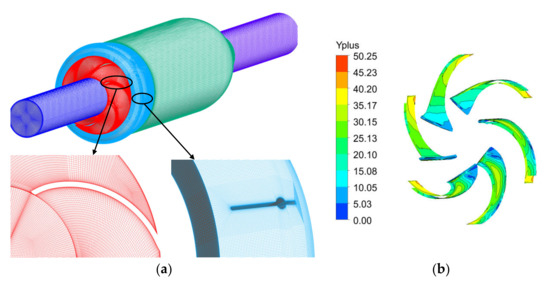 To improve the calculation accuracy and speed up the convergence speed, ANSYS ICEM was used to divide the water body in the calculation domain of the diving tubular pump with a structured grid. As the structured meshes only contained quadrilaterals or hexahedrons in this case, their topological structure was equivalent to a uniformly orthogonal mesh within a rectangular domain. Accordingly, the nodes on each layer of the mesh lines can be effectively adjusted to ensure a high quality [32]. For inlet and outlet pipes, ICEM with an O-Block strategy was adopted to discretize the domains. In addition, to be able to capture more flow details inside the diving tubular pump, the meshes closed to the wall part were locally encrypted. The quality of meshes within all computational domains was above 0.4. The mesh division result and the partial mesh enlargement are shown in Figure 2. To treat the high-velocity gradient, all near-wall surfaces were refined with prism layers. The expansion ratio of near-wall grids is 1.2. Because wall loss is directly affected by the quality of the wall mesh, the boundary layer was applied to improve the quality of the wall mesh. Different models have different requirements for y+ and do not have a fixed value [33,34]. The average values of y+ of each flow passage component are listed in Figure 2b, and it is less than 50 [9]. Because the calculation results were generally satisfactory, the y+ value can be considered as appropriate in this paper.