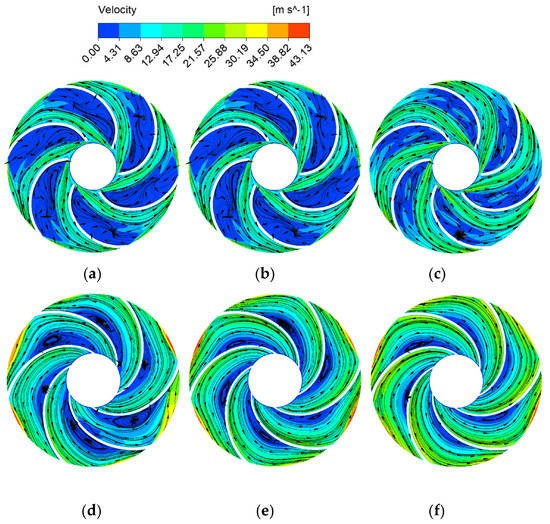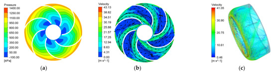 Analysis of the internal flow field of the impeller and the guide vanes. (a) Pressure cloud diagram of the midsection of the impeller. (b) Velocity streamline diagram of the midsection of the impeller. (c) Velocity streamline diagram of guide vanes.