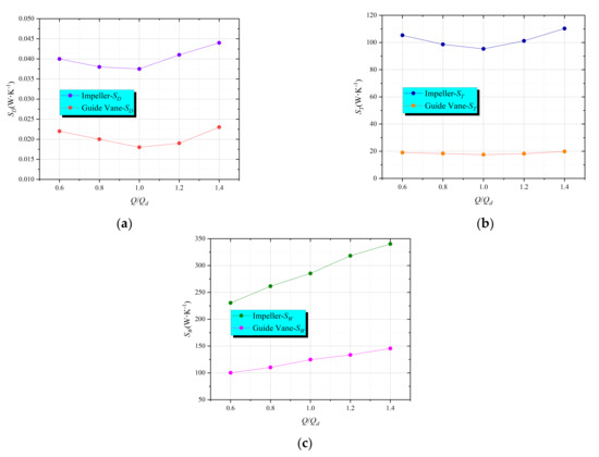 Entropy generation of the impeller and the guide vane. (a) Viscous entropy generation. (b) Turbulent kinetic energy entropy generation. (c) Wall entropy generation.