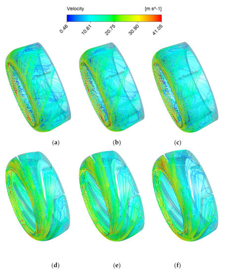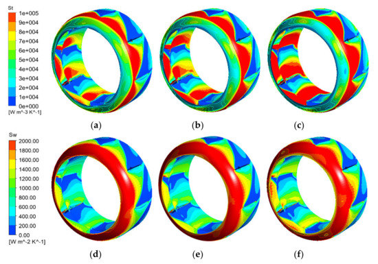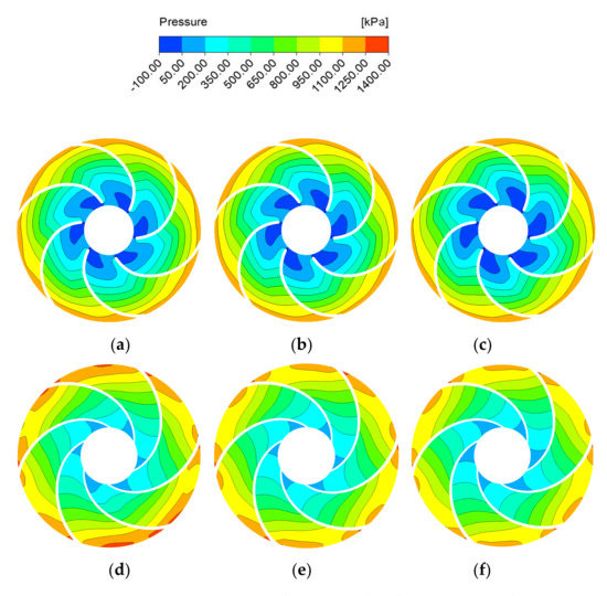 Entropy generation distribution of the impeller. Turbulent kinetic energy entropy: (a) 0.8Qd, (b) 1.0Qd, and (c) 1.2Qd. Wall entropy generation: (d) 0.8Qd, (e) 1.0Qd, and (f) 1.2Qd.