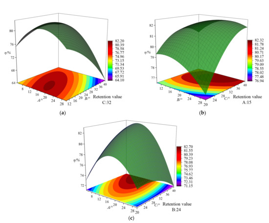 Figure 7 shows the two-factor interaction diagram of efficiency of A, B, and C. It can be seen from Figure 7a that the slopes of the curved surfaces of A and C are steep and parabolic and the efficiency value changes caused by these two factors are relatively large. When C remains unchanged, the efficiency first increases and then decreases with A. When A remains unchanged, the efficiency increases with an increase in C and the contour is presented as an ellipse with large curvature, indicating that the interaction between A and C is significant. It can be seen from Figure 7b that the influence of A and B on efficiency is more complicated. When B is at a low level, the efficiency increases with an increase in A. When A is at a low level, the efficiency increases with an increase in B. The contour lines are presented as ellipses with greater curvature. It shows that the interaction between A and C is more significant; It can be seen from Figure 7c that when C is at a low level, the efficiency decreases with an increase in B. When C is at a high level, the efficiency first increases and then decreases with an increase in B. It can also be seen from the contour lines that C and B have significant interactive effects.
