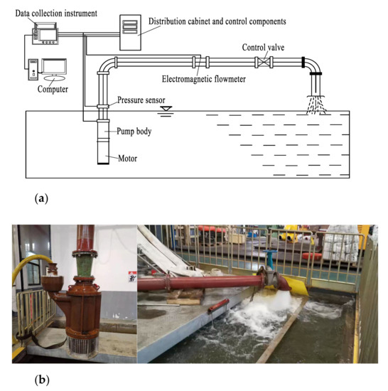 To verify the accuracy of the numerical calculation results, a performance test was carried out on the model pump. Figure 8 is the schematic diagram of the pump test and the test site diagram, and it includes the tested pump, motor, pipes, multifunctional data collector, and so on. The pump was a vertical installation, and an elbow pipe was used to connect the pump and the outlet pipe. The pump outlet pressure was collected by a pressure sensor whose accuracy was better than 0.1%. The flow was measured by the electromagnetic flowmeter with an uncertainty of 0.2%, and the motor speed and other parameters were collected by a multifunctional data collector. The systematic uncertainty of the test rig was 0.36%, which meets the level 1 accuracy requirements specified in ISO9906-2012.