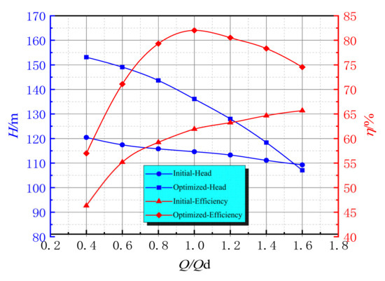 Figure 9 presents the optimization effect of the numerical simulation on the pump performance, and Figure 10 shows the comparison between the test and the numerical simulation after the optimization. It can be seen from Figure 9 that the head and the efficiency of the pump after optimization have been greatly improved compared with those before optimization. The efficiency improvement is most obvious near the design operating point. The performance curve has no camelback phenomenon; the efficiency curve declines slowly under large flow rate conditions, and the range of the high-efficiency zone has been broadened. In addition, the optimal working condition point of the optimized diving tubular pump efficiency is located at the design working condition (1.0Qd), with an efficiency value of 82.34% and head of 136.09 m. The efficiency of the optimized model is increased by 32.99%, and that of the head is increased by 18.71% compared with the initial scheme under design conditions, which fully meets the design requirements. The pump adopts a variable frequency motor, so the frequency converter is used to drive the pump to 3600 r/min during the engineering application. However, the frequency converter will interfere with the test sensor during the experiment. Therefore, the pump test does not use the frequency converter to drive the motor instead of the 50 Hz AC, which could drive the pump to 2900 r/min. To compare the numerical simulation and the test data, the pump flow rate and the pump head are made dimensionless as per Equation (16) and Equation (17), and the results are shown in Figure 10.