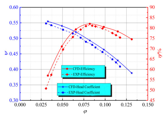 As the mechanical and volumetric efficiency was not considered in simulations, the results obtained by CFD are generally higher than the experimental values. It can be seen from Figure 10 that the trends of the head coefficient curve and the efficiency curve of the test and the numerical simulation are consistent with the flow rate increase. The maximum relative errors of the head coefficient and hydraulic efficiency are lower than 5%. The absolute predicted deviations for the head coefficient and hydraulic efficiency at the design condition are 2.47% and 2.92%, which proves that the optimization method and the numerical simulation method adopted in this research are correct and feasible.