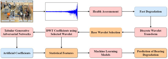 Figure 1 shows the flow chart of the proposed methodology. In this paper, as shown in Figure 1, the first section is about the FEMTO bearing dataset. The second section is about the preprocessing of the data, where a health assessment is carried out to identify bearing degradation. The second part of section two is about discrete wavelet transform (DWT) and the selection of the base wavelet using mutual information (MI). The next part of section two is about making artificial data using a tabular generative neural network (TGAN). The last parts of section two are about the extraction of time–domain statistical features calculated on both the real data as well as on artificial data, followed by a short description of machine learning models. In the seventh section, bearing degradation is estimated using the machine learning models, followed by the last section of the conclusion.