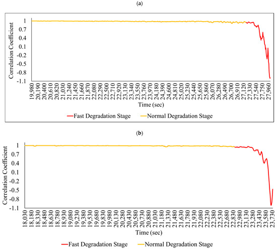 As per Mao et al. [18], normal degradation and fast degradation can be identified on the basis of the correlation coefficient. If the correlation coefficient value lies consistently below 0.95, then it can be considered as being the bearing fast degradation state. The idea is to use the robustness of SVD, as with change, the correlation coefficient of SVD for the normal stage is comparatively higher than the correlation coefficient of SVD for the faulty stage. SVD also takes into account the noise, and minor deviations to the health assessment as the change in its value will be slight if the deviation is small, and if the signal varies greatly, it will show a large amount of change in its values. Thus, Wentao Mao et al. [18] concluded that the singular value decomposition (SVD) normalized correlation coefficient can be used to accurately find the change in a bearing’s health state when the vibration signal varies drastically.