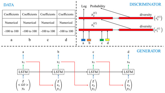 As observed in Figure 5, the generator was developed using a long short-term memory (LSTM) neural network with a hidden vector , where was the output of LSTM and was the learned parameter in the network. The input to the LSTM was the random noise z, the hidden vector x and the weight vector y. The output was calculated as for discrete variables. A cross-entropy loss, along with KL divergence, was used as a loss function. For the discriminator, a multi-layer perceptron (MLP), an n-layer fully connected neural network, was used, and a1:n, b1:n and c1:n were fed in a concatenated manner. The first layer and the ith layer were calculated as,