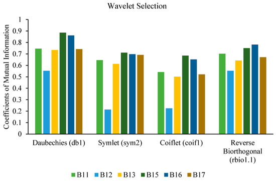 A function is selected as a base function when MI shows the maximum amount of dependency. In this study, the base functions of wavelets compared were Daubechies (db1), Symlet (sym2), Coiflet (coif1), and reverse Biorthogonal (rbio1.1). All six bearings were considered at a speed of 1800 rpm and a load of 4000 N to select the base function of the wavelet. It is clear from Figure 7 that Daubechies (db1) shows the highest MI as compared to other wavelets functions, and was therefore selected to calculate DWT-based statistical features.