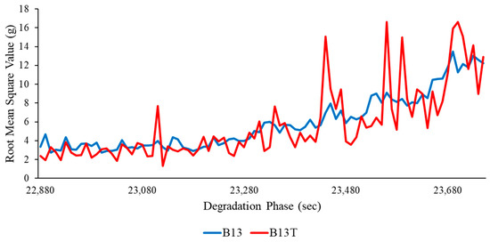 Table 1 shows the FEMTO bearing dataset generated by PRONOSTIA, which has acceleration values collected at a sampling frequency of 25.6 kHz as the data for a total of seventeen bearings, of which, seven were in condition 1 and 2, while three were in condition 3. In this study, the vibration data of six bearings operated at the radial load of 4000 N and 1800 rpm is used. Figure 3 shows the plot of the vibration signal against time for bearing 11 and bearing 13.