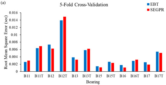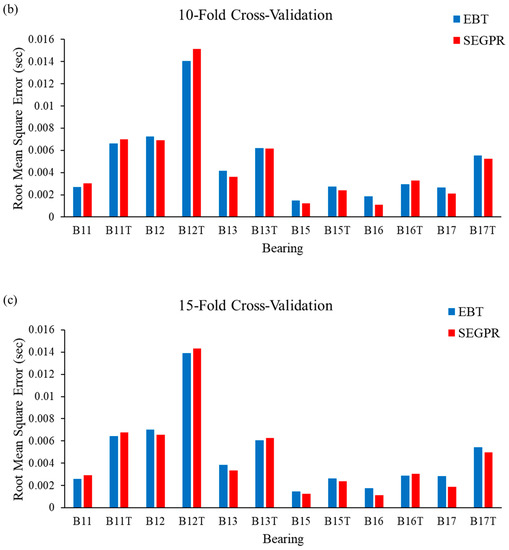 In the current study, two ML models were used to evaluate the degradation of six bearings conditions. Initially, training was executed using the real and generated feature vectors, and afterwards, five-fold cross-validation, ten-fold cross-validation and fifteen-fold cross-validation were performed on ML models. Cross-validation is a resampling procedure which is used to evaluate machine learning models, so that bias and overfitting can be avoided and generalization capability can be improved. In five-fold cross-validation, datasets are first divided in to five equal parts, and for the first fold, one part is used for testing and the other four parts are used for training. In the second fold, two parts are used for testing and three parts are used for training. The procedure repeats for the rest of the portions and the predictions are generated after averaging all folds. In the present study, for five-fold, ten-fold and fifteen-fold cross-validation, mean RMSE and MAE were computed after applying EBT and SEGPR models.