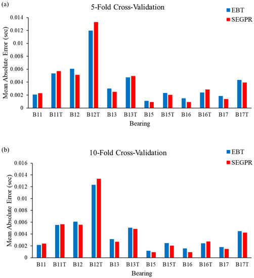 - With the SEGPR model, the lowest MAE value observed was 0.0037 when fifteen-fold cross-validation was implemented, whereas with the EBT model, the lowest MAE was observed as 0.0038 with five-fold cross-validation.