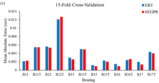 To justify the utility of the proposed methodology, MAE values were calculated and plotted, which can be observed in Figure 10a–c. From Figure 10a, it can be seen that the performance of the SEGPR model was better than the EBT model, as the average MAE value for all the bearing degradation conditions, as well as original and generated data, was 0.0038, as compared to 0.0039 with the EBT model. Figure 10b represents the average MAE value obtained after applying the EBT and SEGPR models with ten-fold cross-validation. The average MAE values obtained after applying ML models were 0.0039 and 0.0040 with SEGPR and EBT models, respectively. Similarly, the average MAE values obtained after applying ML models were 0.0037 and 0.0039 with SEGPR and EBT models, respectively. Figure 10c shows when a fifteen-fold cross validation procedure was applied. It can be seen that, once again, the SEGPR model predicted bearing degradation better than the EBT model, based on MAE performance metrics. It should be noted that all the RMSE and MAE values were very small and were under the permissible limit of industry and research conditions. One of the reasons for the better performance of the SEGPR model is that the kernel function squared exponential is infinitely differentiable, which generates a smooth curve, which enables the easy fitting of the data. To verify the effectiveness of the proposed methodology, a comparison table with the previously published literature, Table 4, was prepared, in which different authors have used the same bearing degradation dataset. It can be seen that with smaller datasets, the prediction results are comparatively better than when TGAN is utilized with wavelet transform and the SEGPR model.