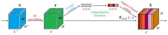 The channel attention module is shown in Figure 3. For any given function mapping F: X → Y, the feature channels in a certain convolutional layer are reordered by constructing a corresponding SE attention module. The feature map X is transformed into the feature map Y through three-dimensional convolution, then the dimension of feature map is pooled from H to 1 through the “squeeze” operation, which generates a channel descriptor corresponding to each feature map one by one. The global distribution of the channel-wise feature response is embedded into those one-dimensional channel descriptors, so that the underlying receptive field information, which is more important to the detection results, can be used by the deeper convolutional layer. The neural network learns the importance of each channel to the final detection result by a gating function that can describe the channel dependence. Then, each feature map is reordered on the basis of its importance to generate the output from the attention module. Finally, the recalibrated feature map is directly input into the subsequent convolutional layers.