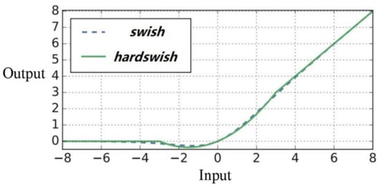 Engineering practice demonstrates that most of the weights in convolutional neural networks are distributed between [−10, 10]. Therefore, only the nonlinearity of the activation function near 0 can be retained, and other intervals can be adjusted as linear operations to reduce the complexity of the activation function and the amount of system calculation. According to this conception, we change the sigmoid nonlinear part of the swish function to the ReLU linear operation, as shown in Formula (11). Then, the smooth part of the swish curve will become sharper, which is conducive to the rapid calculation of the embedded hardware platform. Figure 4 shows the difference between the swish and hardswish function.