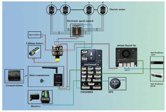 We chose the NVIDIA jetson NX-embedded platform as the onboard computer for the micro aerial robot, utilized Intel Realsense T265 binocular camera to provide pose estimation for the aerial robot, and used Intel Realsense D435i stereo camera as the input of the depth neural network. The 410 mm wheelbase quadrotor MAV serves as the carrier of onboard computer and cameras. Pixhawk4 is used as the flight control hardware platform, and the PX4 is chosen as the flight control firmware. The ground station is connected with the Pixhawk4 and airborne computer through WiFi and Ethernet, respectively. Before the aerial robot can fly, it is necessary to implement the offline pre-trained object detection system to the airborne computer in advance. The detailed description is shown in Figure 6.