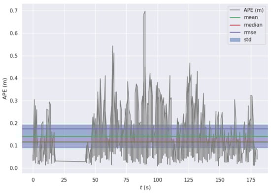 The change of absolute pose error (APE) as time goes on in sequence MH01. RPEOD will inevitably drift over time, which is an inherent characteristic of all visual odometers. Fortunately, thanks to the local bundle adjustment, the APE of the RPEOD system is always within a reasonable range.