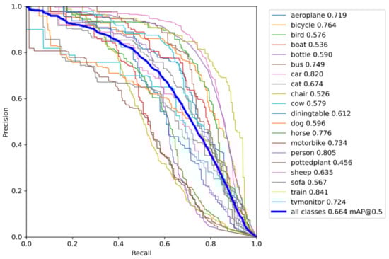 The GPU employed in the neural network training process is NVIDIA GTX1660. The development environment is pytorch1.8, the initial learning rate during YZNet training is 0.01, the weight attenuation rate is 1 × 10−5, the momentum is set to 0.9, and the batchsize is set to 8. Rmsprop is selected as the neural network training optimizer. The resolution of the three channel color image is 640 × 480. After 60 epochs, the network converges completely, and the whole training process takes about 9 h. Because the network structure of YZNet has been reasonably optimized, and each convolution module is embedded with a hierarchical batch normalization module, even if the pretrained parameters are not imported for initialization, the model training process can fully converge in a short time. We recorded the PR curve generated by each category during the neural network training, as shown in the Figure 9.