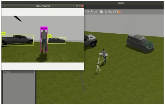 Due to the instability of the aerial robot control system, a simulation test is usually needed before real-world flight, which can effectively avoid the aerial robot crash caused by a program error, as shown in Figure 11. After taking off, the aerial robot uses a T265 binocular camera to obtain the relative relationship between the body coordinate system and the world coordinate system. Secondly, YZNet-YOLOV5 is used to find the preseted target (which can be modified manually), and the depth information captured by the D435i stereo camera is fused to obtain the transformation matrix between the tracked target and the D435i camera, so as to further calculate the position of the tracked target in the world coordinate system. When the positions of MAV and target are determined, the aerial robot will automatically generate a desired position in the world coordinate system, then, fly to the desired destination and keep a fixed distance from the tracked target. If the target moves, the aerial robot will automatically follow the target.