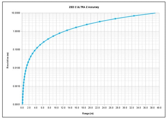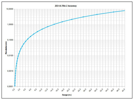 Figure 4 presents the accuracy graph of the ZED depth sensor depending on the distance of an object from the depth camera. As shown, the depth resolution, i.e., the depth precision, is impaired with increasing distance [16].