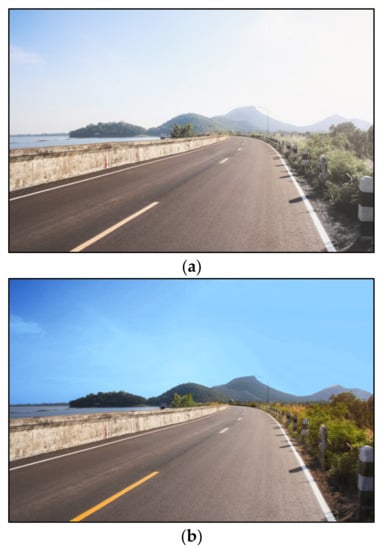 Effect of the polarizer on a scene: (a) without polarizer, (b) with polarizer (courtesy of Stereolabs) [16].
