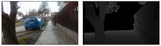 The third example in Figure 8 was recorded with the ZED depth sensor. The color image on the left contains much more detail. The reason for this wide view was the wide FOV of both ZED depth sensors. Moreover, since the modest quality laptop without the GPU was used for the recording, the maximal supported resolution was only 672 × 376 pixels. Despite the poor resolution, the recorded scene is of good quality. The recording was done with the ZED Explorer [16], and the images were saved in *.svo [16] files. Later, using the desktop computer and the NVidia GPU, the depth maps were generated via the ZED Depth Viewer Tool [16]. The reason for this was the absence of a high-quality GPU on the laptop as required by the ZED depth cameras for depth calculation [16,17]. Unfortunately, the original resolution of the saved images could not be changed during the depth determination; hence, the depth measurement was done with a resolution of 672 × 376 pixels. The corresponding depth map is shown on the right.