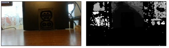 The third example shows the images obtained from the ZED depth camera. The color image on the left can be considered as perfect. The generated depth map in the right is very accurate; the AC socket is clearly visible, including the child protection holes (the round white area in the middle of the AC socket). This result was very good, despite the junction box not being visible (which was not the goal of this experiment). The reason why the junction box is not visible lies in the illumination from the left. The junction box got more light, this light blinded the camera sensors, and the objects illuminated from the left, i.e., the junction box, are not visible in the depth map [16]. This is a common problem with passive stereo cameras because the illumination can cause false detection [16].