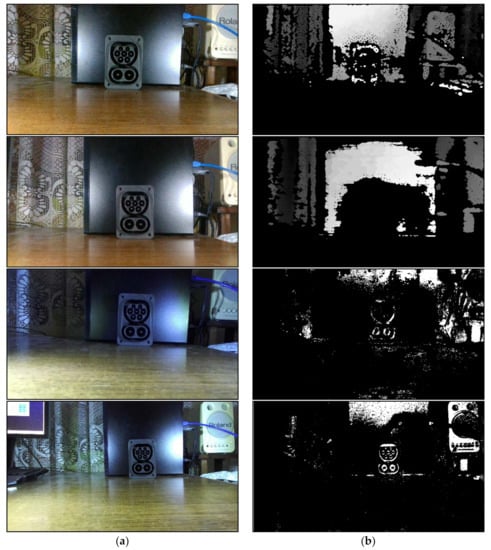 Examples of very dark electric car charger socket depth measurement: (a) color images from the left camera, (b) corresponding depth maps.