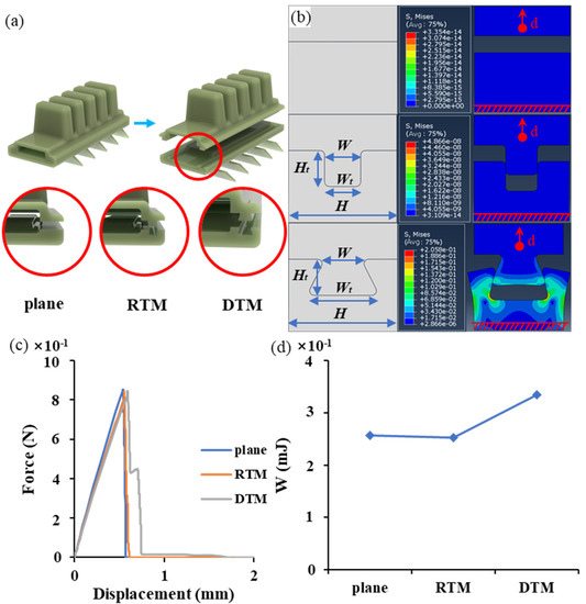 Finite element analysis and corresponding results of plane models for three different parting structures (plane, right-angle tenon-and-mortise (RTM), and dovetail tenon-and-mortise (DTM)): (a) diagram of three parting structures; (b) finite element analysis of plane models for three parting structures under the same displacement (0.6 mm); (c) interfacial separation force; and (d) avulsion energy of three parting structures generated during interface separation.