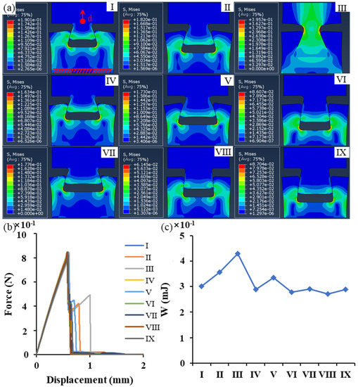 Finite element analysis and corresponding results for plane models of nine DTM parting structures: (a) finite element analysis of plane models for different DTM parting structures under the same displacement (0.6 mm); (b) interfacial separation force of nine DTM parting structures generated during interface separation; and (c) avulsion energy of nine DTM parting structures generated during interface separation.