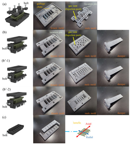 Figure 4. Exploded and physical diagrams of mold: (a) upper cavity fold molds; (b) lower cavity abdomen molds (unembedded objects); (b’-1) first set of lower cavity abdomen molds (embedded objects); (b’-2) second set of lower cavity abdomen molds; and (c) flap molds. - Using tapered pins and screws to locate and lock between male and corresponding female molds. Taper pins are precisely located and easy to separate, while screws can not only ensure the stability of mold clamping, but also facilitate disassembly.