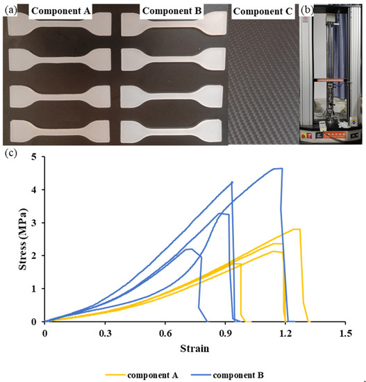 Tensile test for elastic moduli of materials: (a) three component materials; (b) tensile testing machine; and (c) results of tensile test.