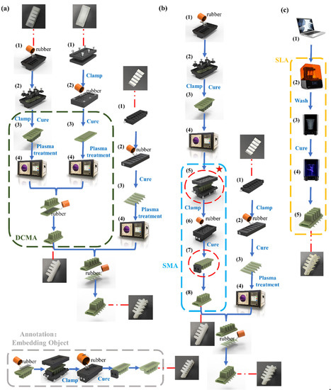 For the purpose of reflecting the characteristics of the proposed “simultaneous molding and assembly” process, three processing methods (the DCMA process (Figure 6a), SMA process (Figure 6b), and SLA technology (Figure 6c) were introduced and compared.