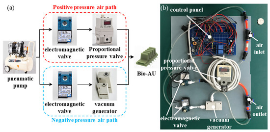 In this section, the performance of the finished samples fabricated using the above three processes were studied and compared respectively, which can test the feasibility of the DCMA process. It includes the bending performance (bending angle ) and pressure-bearing capability (pressure-bearing range) of the Bio-AU under different air pressure values. The definition of the pressure-bearing range is as follows: when the positive pressure is broken, the air pressure value of the Bio-AU is the maximum positive pressure value; when the Bio-AU is upturned under negative pressure and the deformation is stable, the initial air pressure value of the Bio-AU is the maximum negative pressure value. In this study, the machine with SLA technology is Form3 (Formlabs, Boston, USA). The material used is flexible resin elastic 50 A, the elastic modulus of which is about 2.89 Mpa, and its hardness after secondary curing is 50 A. The weights of the finished Bio-AU samples fabricated by the three processes above were measured to be 26.9 (±0.53) g, 26.7 (±0.31) g and 27.9 (±0.16) g, respectively. The performance test platform includes the pneumatic drive system (Figure 7), the Bio-AU fixture and the image acquisition device (See the Supplementary Materials for instructions for use of the pneumatic drive system).