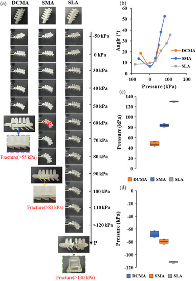 Figure 8 shows the bending and pressure-bearing properties of the Bio-AU samples fabricated using the above three processes. The angle between the line connecting the first and last points of the Bio-AU and the horizontal line was defined as the bending angle of the Bio-AU (Figure 8a). As shown in Figure 8a, because both the DCMA and SMA processes belong to the lamination mold casting process, the bending angles of the respective samples are similar under the same pressure, and the rupture failure of the respective samples occurs at the parting surface. The size of the rupture opening of the DCMA sample is significantly larger than that of the SMA sample, which illustrates that the cavity fabricated by the SMA process has a higher assembly accuracy and pressure-bearing capability. When the driven pressure was 80 kPa, the bending angle of the SMA sample was approximately 50.9°, which was significantly larger than that of the SLA sample (24.6°), indicating that the bending performance of the SMA sample was better than that of the SLA sample under the same pressure.